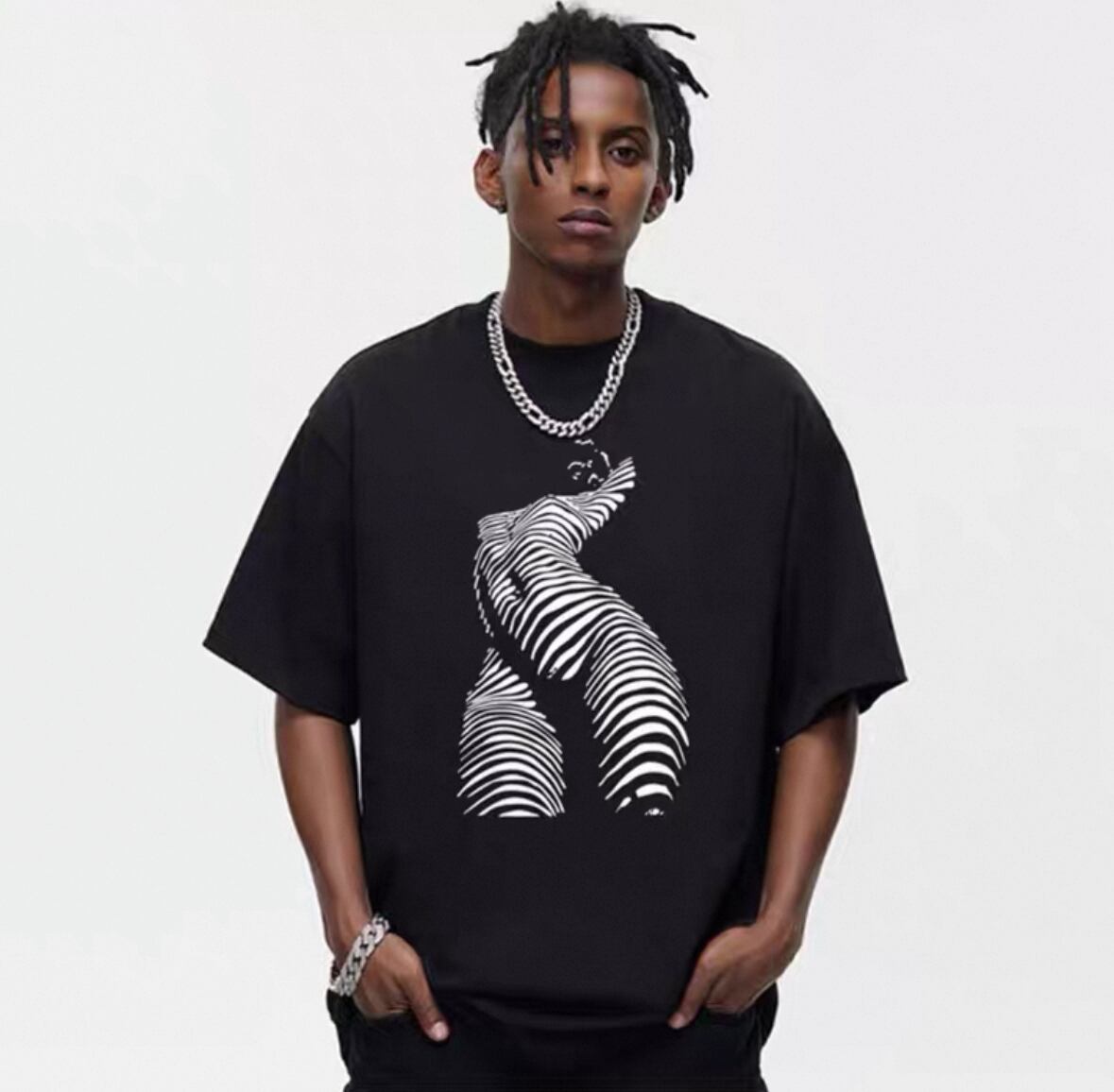 洗練されたデザインと高い機能性を兼ね備えたこのTシャツは、カジュアルな日常からスタイリッシュなシーンまで幅広くご利用いただけるアイテムです。 印象的なカーブデザインが特徴で、どんなコーディネートにも個性的な魅力を加えています。 軽やかな素材を使用しており、快適な着心地が実現され、これからの季節にもぴったりな一着となっています。 ユニークなデザインがあなたの個性を引き立てる楽しさを提供します!さまざまなスタイルに合わせやすく、普段使いからスポーツシーンまで幅広く活躍します。 【カラー】ブラック 【サイズ展開】M / L / XL / 2XL / 3XL 【素材】コットン・ポリエステル混紡 【購入に際してのご注意】 - サイズにご注意ください。 - 発送には3週間〜1ヶ月程度お時間をいただいております。 - 返品交換はできかねますので、予めご了承ください。